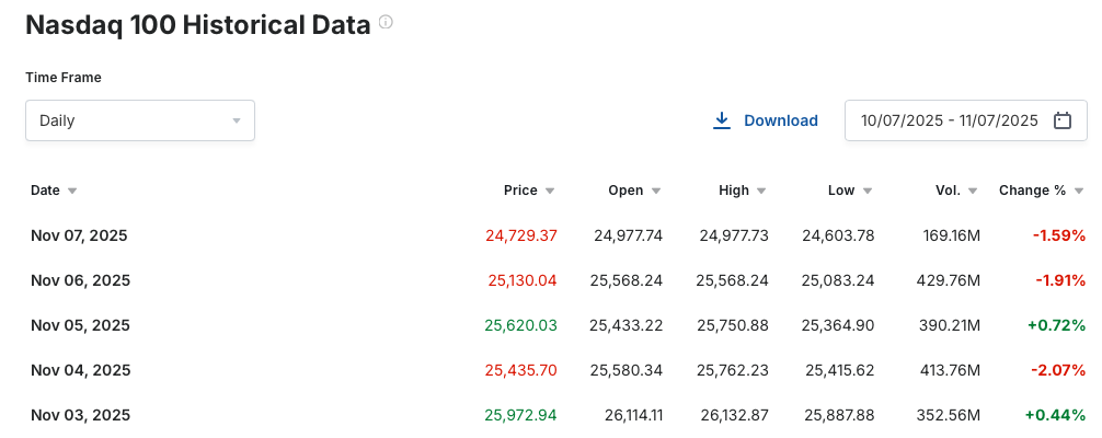Der Nasdaq 100 notiert inzwischen rund 5% unter seinem Allzeithoch, dem S&P 500 fehlen etwa 4% zu den Rekordständen vom Ende Oktober.