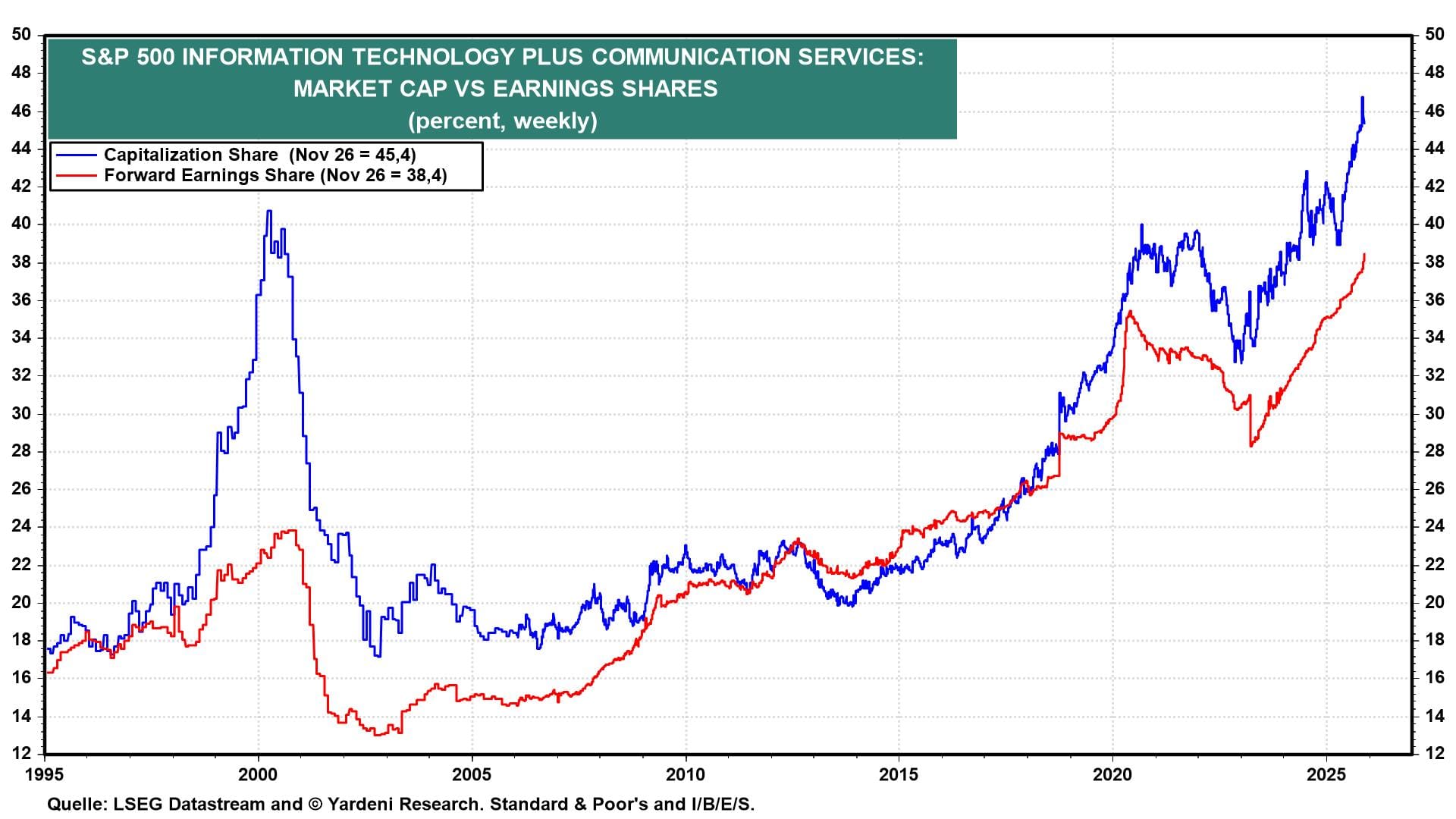 Diese machen zusammen aktuell 45,4% der gesamten Marktkapitalisierung des S&P 500 aus (blaue Linie), während ihr Anteil an den erwarteten Unternehmensgewinnen nur 38,4% (rote Linie) beträgt.