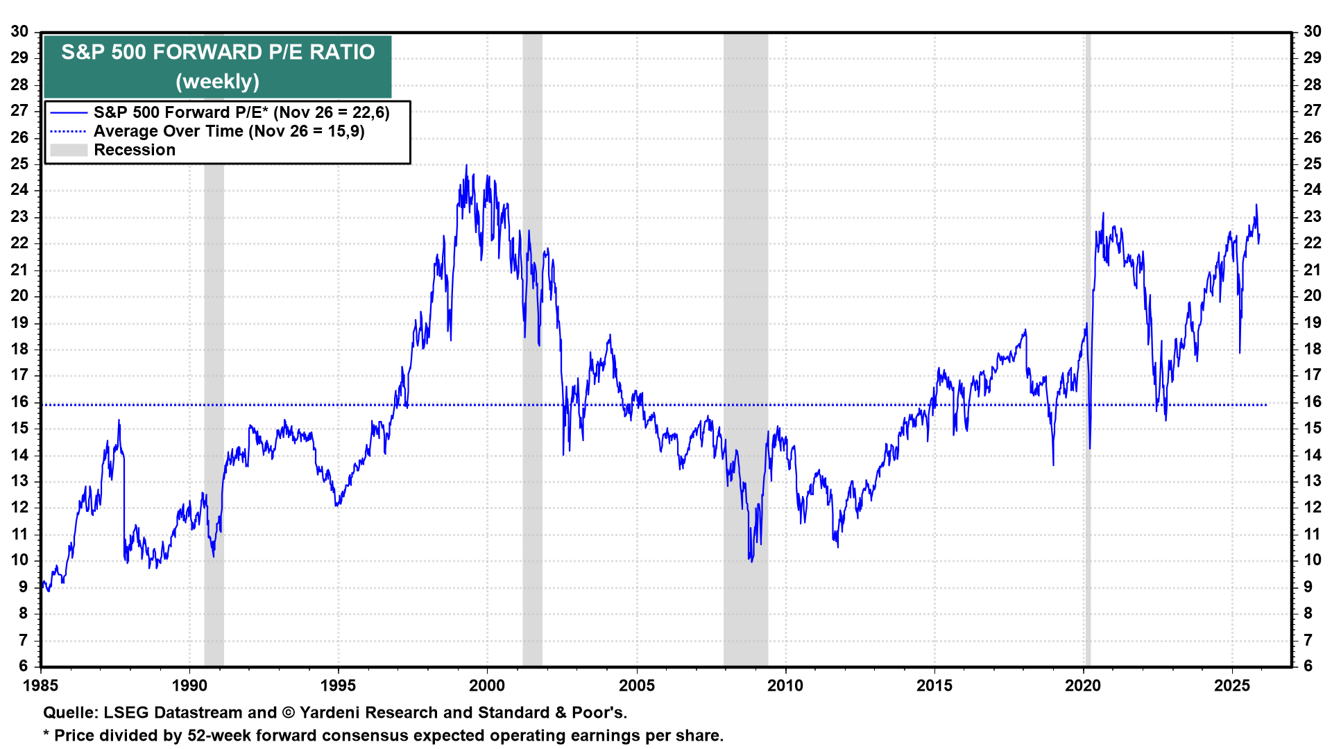 Doch bei aller Zinssenkungseuphorie sollten wir die aktuellen Bewertungen nicht außer Acht lassen. Das Forward P/E-Ratio des S&P 500 liegt derzeit bei 22,6. Das ist deutlich über dem langfristigen Durchschnitt von 15,9.