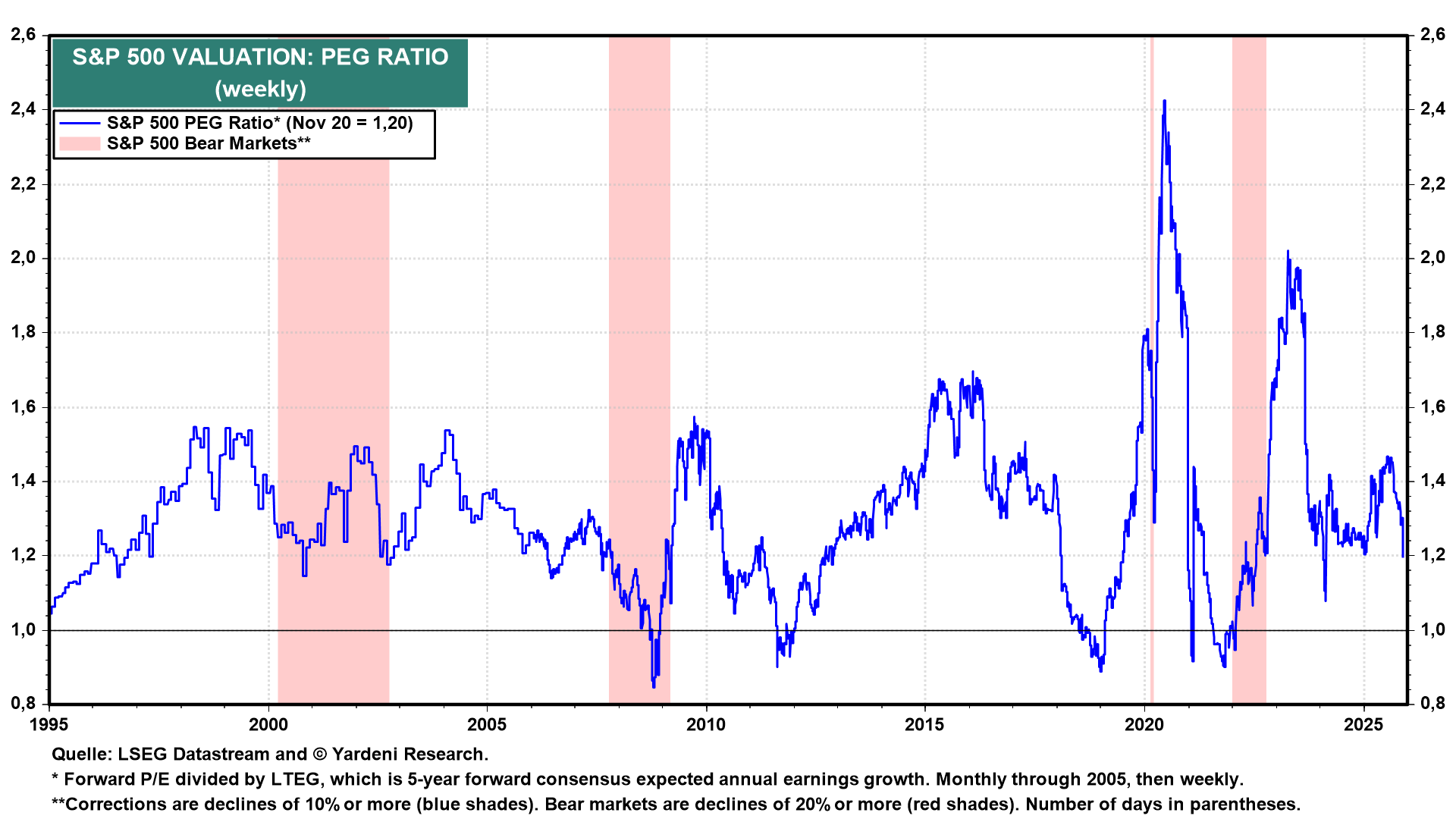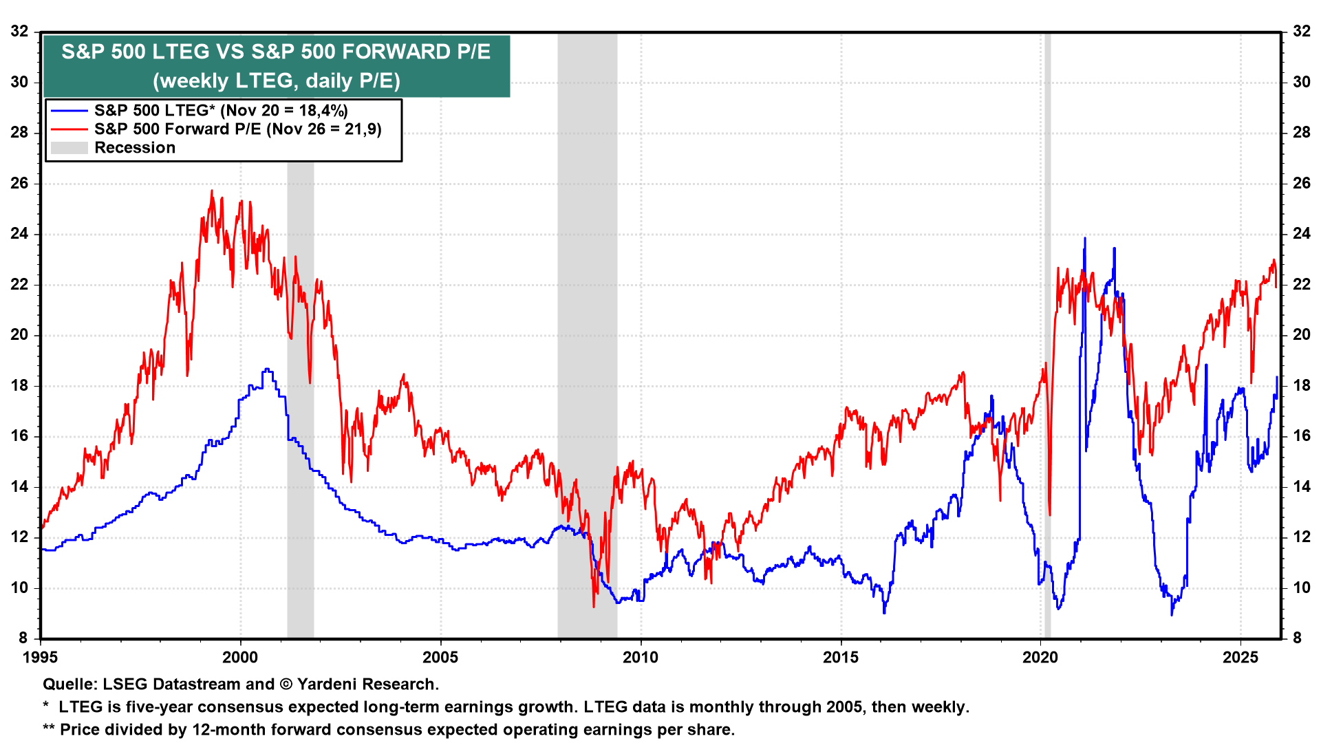Diese Kluft zwischen Bewertungsniveau und Wachstumserwartungen sollte nicht zu groß werden. Historisch gesehen tendieren die beiden Linien dazu, sich anzunähern, entweder durch steigende Gewinnerwartungen oder durch Kurskorrekturen.