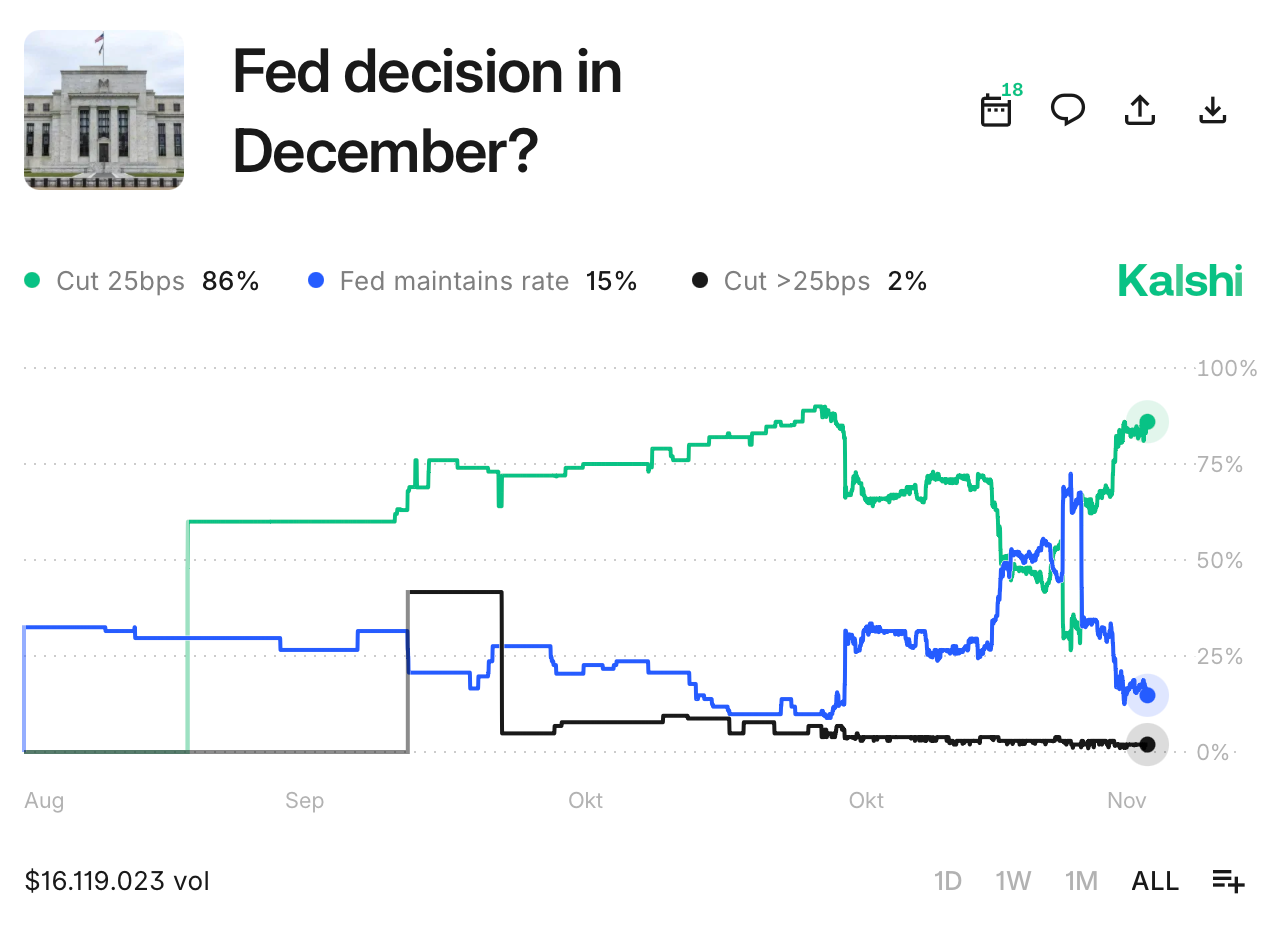 Auch die Kalshi Prediction Markets zeigen eine ähnliche Erwartung von 86%.