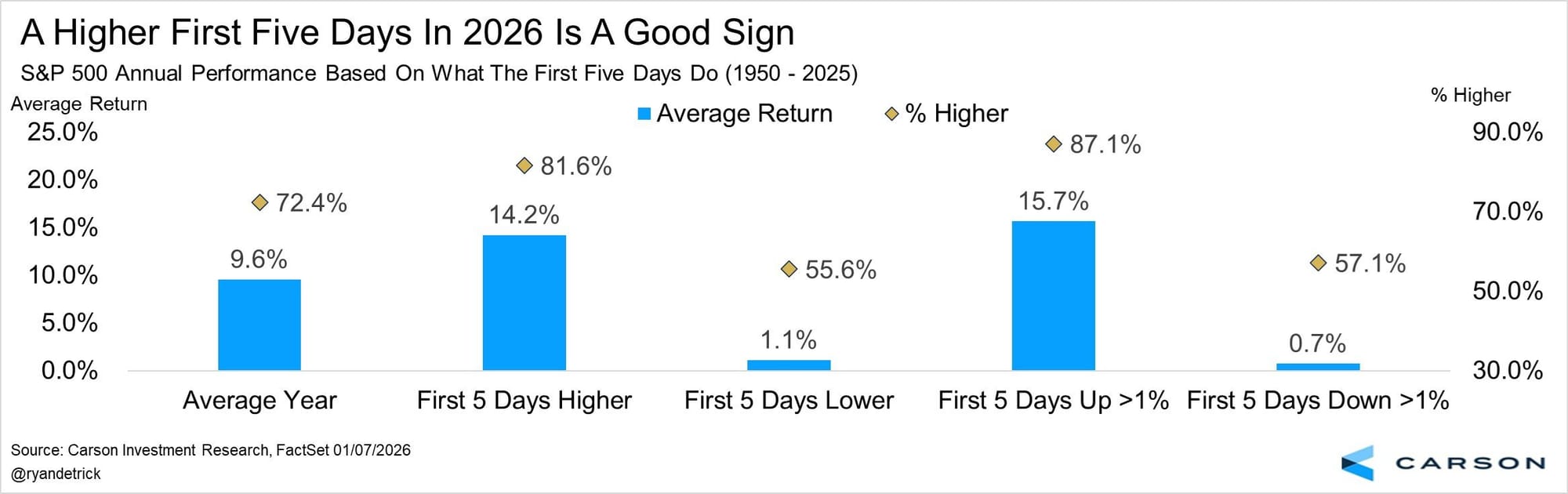Ein Blick auf die sogenannte "Rule of First 5 Days" liefert zumindest eine statistische Einordnung: Steigt der S&P 500 in den ersten fünf Handelstagen um mehr als 1%, endet das Jahr historisch in über 87% der Fälle positiv, mit einer durchschnittlichen Jahresrendite von knapp 16% (basierend auf Daten seit 1950).