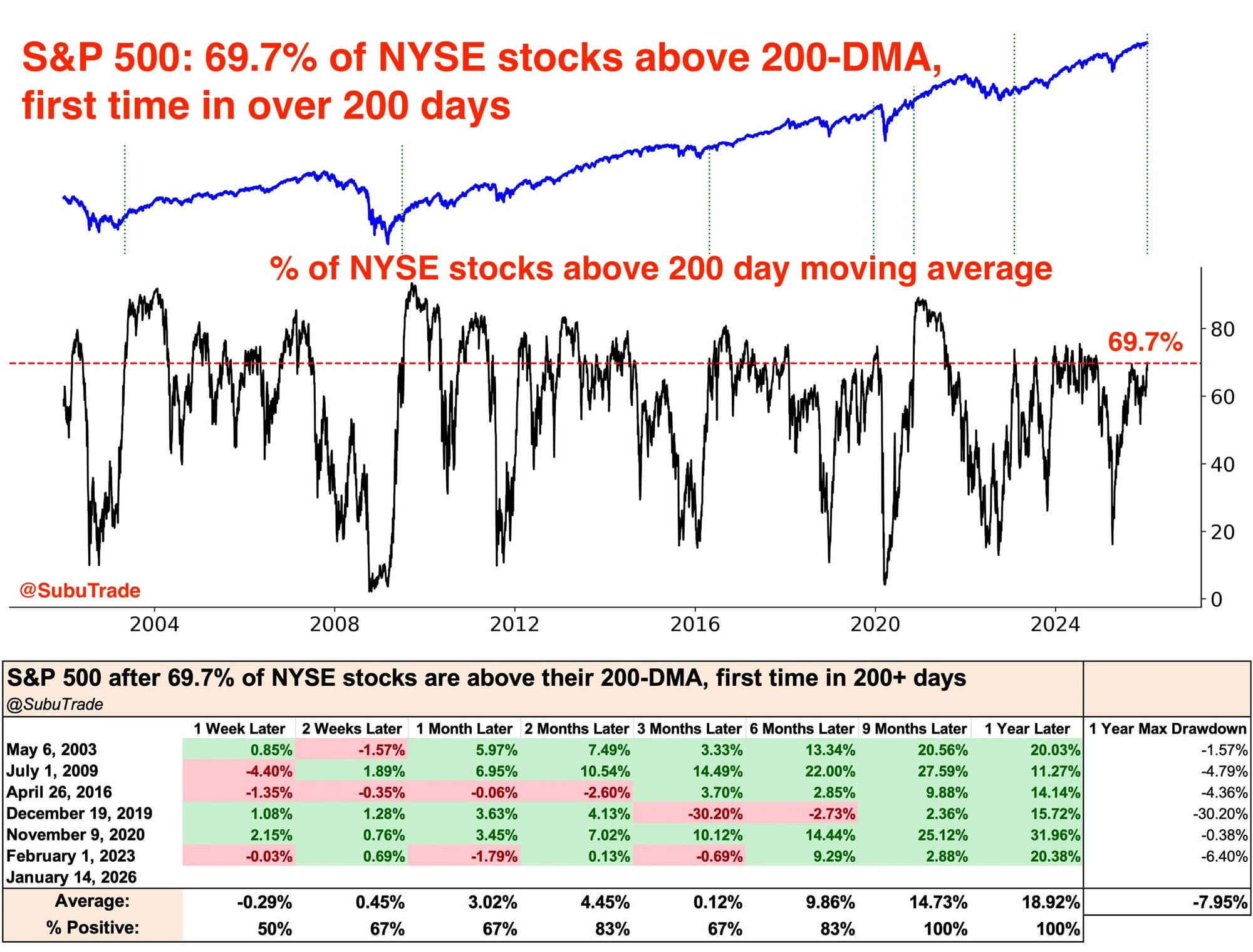 Lange Zeit wurde die Rallye nur von einer Handvoll Tech-Giganten getragen. Das scheint sich langsam zu ändern: Zum ersten Mal seit 2024 notieren knapp 70% der an der New York Stock Exchange (NYSE) gelisteten Aktien über ihrem 200-Tage-Schnitt – ein Signal, das die breite Stärke innerhalb des S&P 500 widerspiegelt.