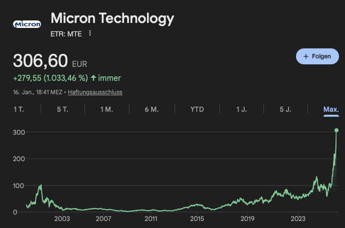 Hier wird es interessant: Micron war historisch ein Paradebeispiel für eine zyklische Entwicklung. Der Speicherchip-Markt durchlief regelmäßig Boom-and-Bust-Zyklen, getrieben durch Überkapazitäten und anschließenden Preisverfall. Das trieb die Aktie von Micron dann wieder in den Keller.
